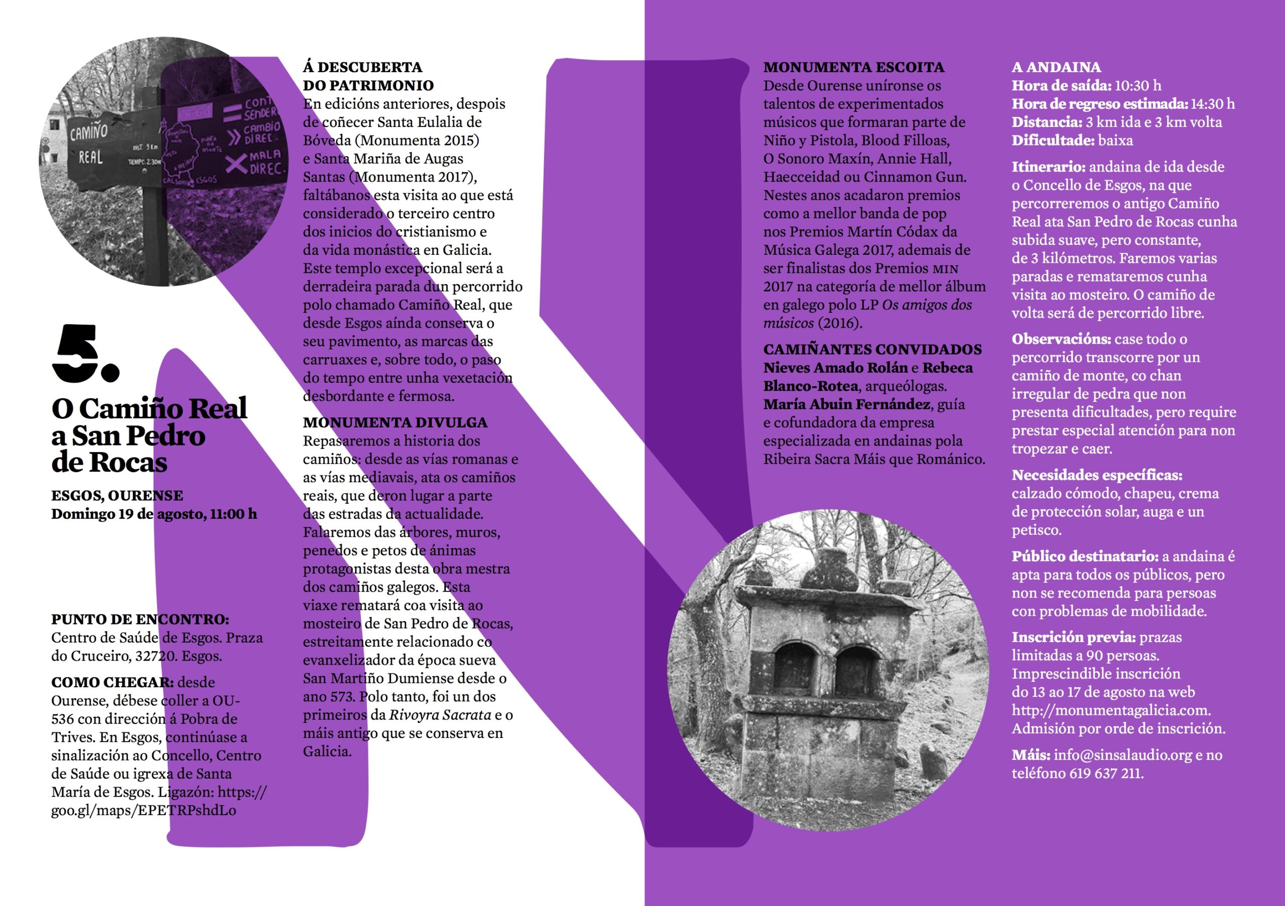 En edicións anteriores, despois de coñecer Santa Eulalia de Bóveda (Monumenta 2015) e Santa Mariña de Augas Santas (Monumenta 2017), faltábanos esta visita ao que está considerado o terceiro centro dos inicios do cristianismo e da vida monástica en Galicia. Este templo excepcional será a derradeira parada dun percorrido polo chamado Camiño Real, que desde Esgos aínda conserva o seu pavimento, as marcas das carruaxes e, sobre todo, o paso do tempo entre unha vexetación desbordante e fermosa.
